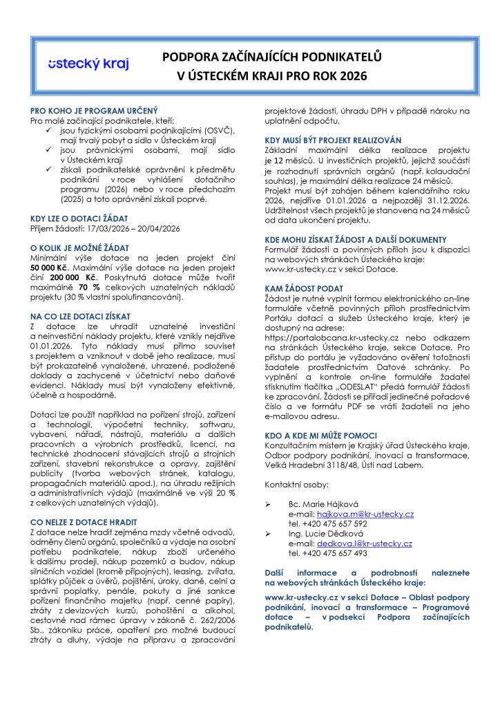 Podpoda začínajících podnikatelů v Ústeckém kraji pro rok 2026